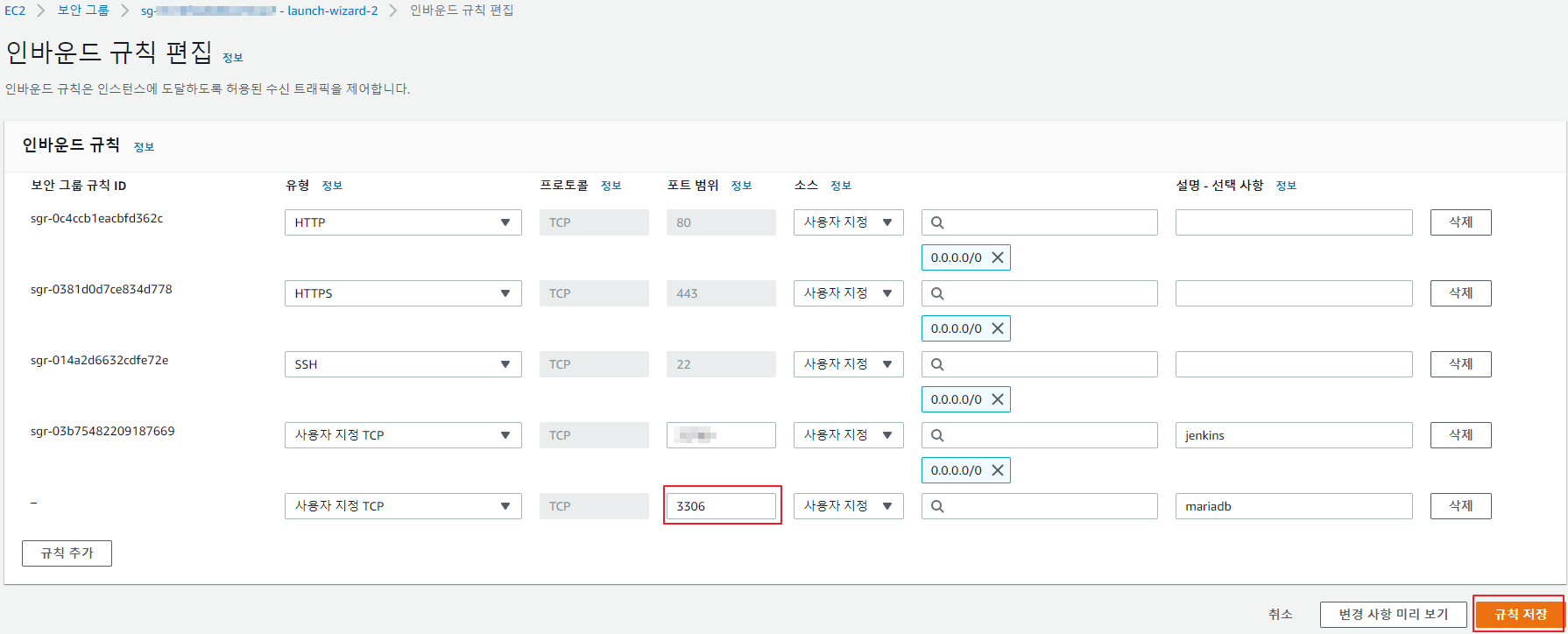 AWS 인바운드 규칙 변경 (3306 포트 접근 허용)
