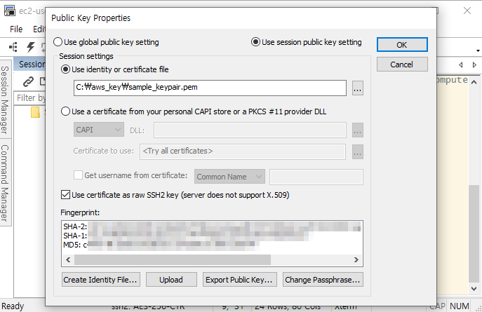 Use session public key setting 을 선택하고 EC2 생성시 다운받았던 키페어를 등록.