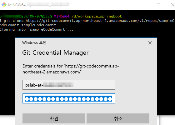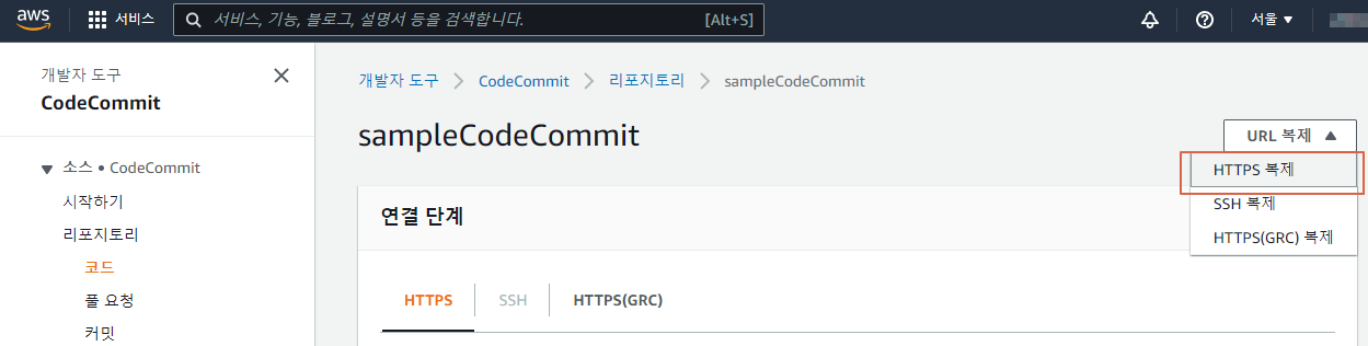 $ git clone https://git-codecommit.ap-northeast-2.amazonaws.com/v1/repos/sampleCodeCommit sampleCodeCommit