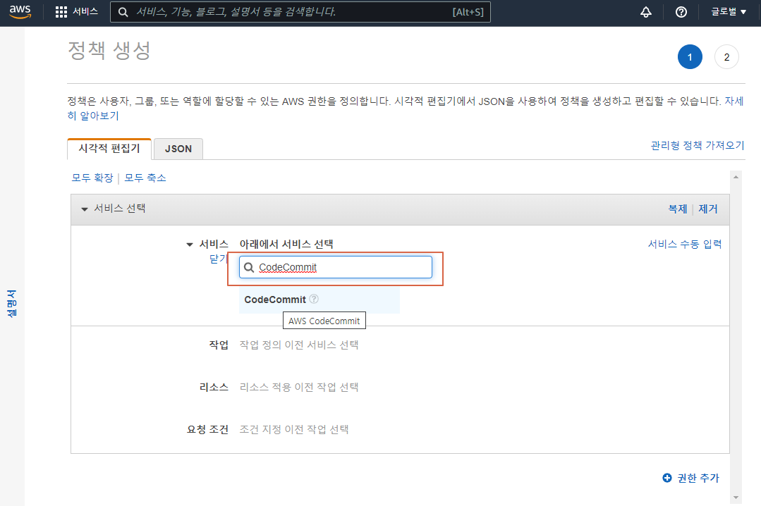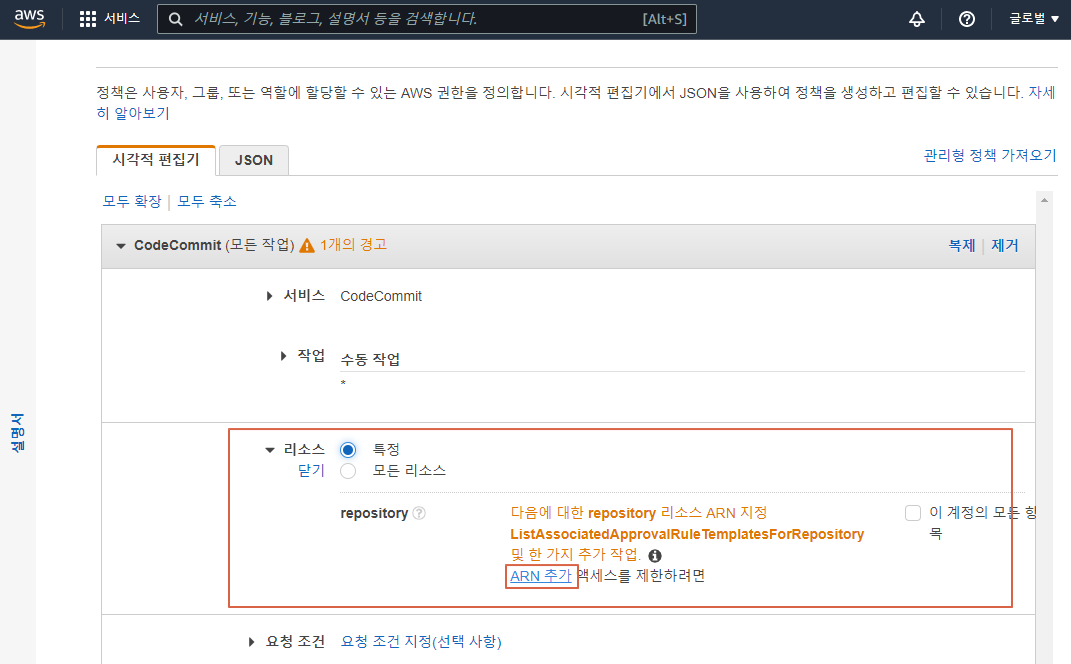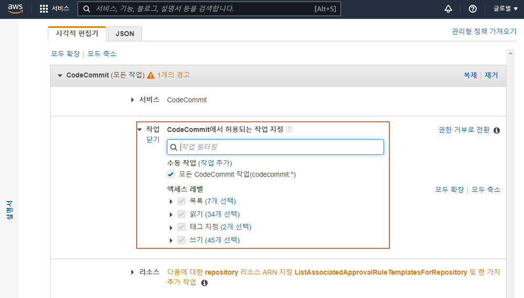 CodeCommit 서비스 선택 및 특정 리소스 추가