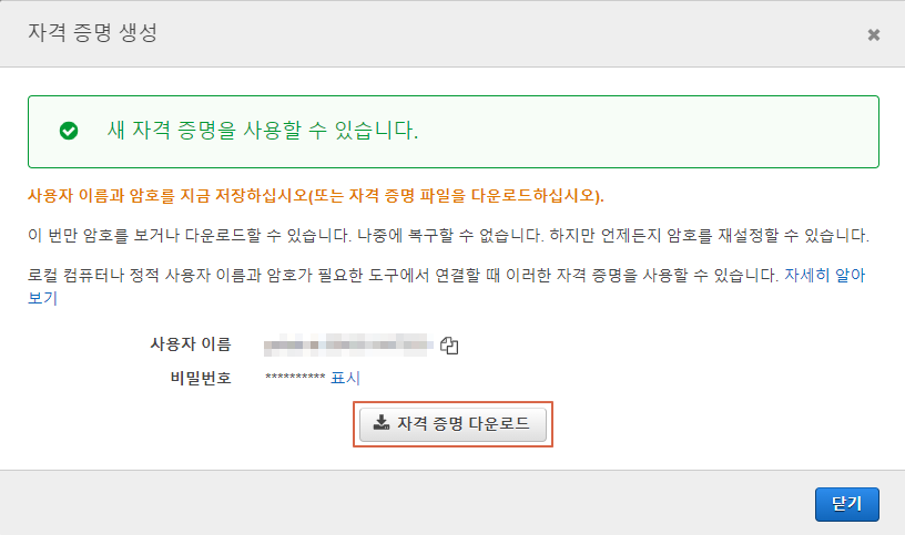 자격증명을 다운로드 받으면 CodeCommit(Git) 에 접근 할 수 있는 User Name, Password 정보가 있다.