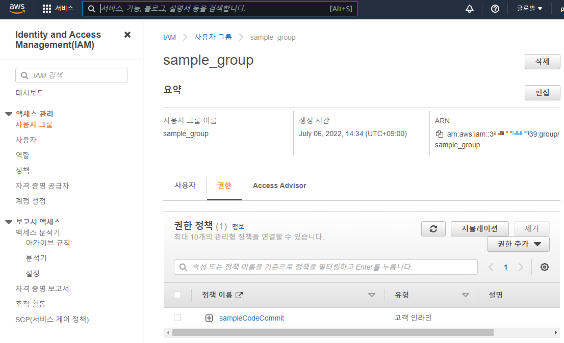 sample_group 에 sampleCodeComit 정책을 추가한 모습