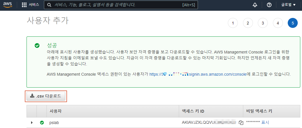 csv 파일에는 User name, Password, Access key ID, Secret access key, Console login link 정보가 포함되어있다.
