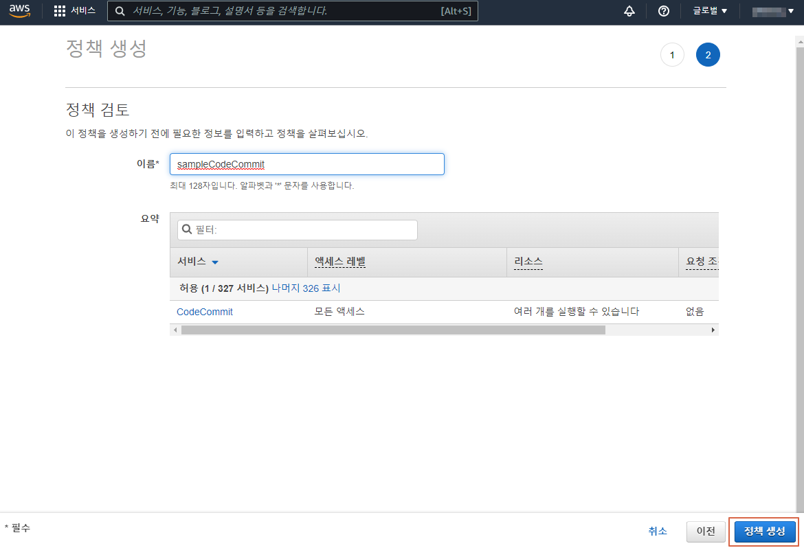 CodeCommit에 아래 그림처럼 모든 권한을 추가하면 모든 레포지토리에 접근 할 수 있는 강력한 권한이 생성된다.