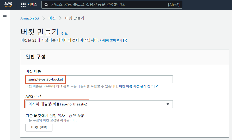 버킷만들기 - 버킷 이름, 리전 입력